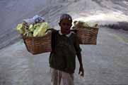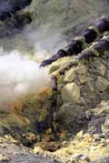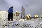 Je to jak cesta do pekla. Vše je pokrytou žlutou sírou, ve vzduchu je síra cítit a občas není díky sirným výparům na krok vidět. U jezírka na dně kráteru se provádí těžba. Místní dělníci odlamují pláty zkondenzované síry a plní si jimi nůše, v kterých síru odnášejí na parkoviště pod sopkou. Nejdříve 30 minut do prudkého kopce a poté tak hodinu naopak z prudkého kopce. Přitom na zádech nůše, v kterým je něco mezi 80-100 kg síry. Neskutečně těžká práce. Každý den absolovují tuto cestu dvakrát.