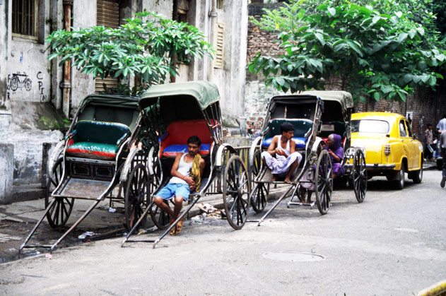 Odpočívající rikšové v Kalkatě. Indie.