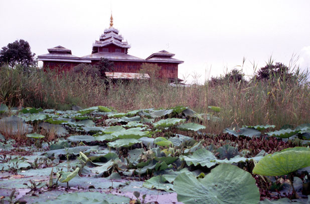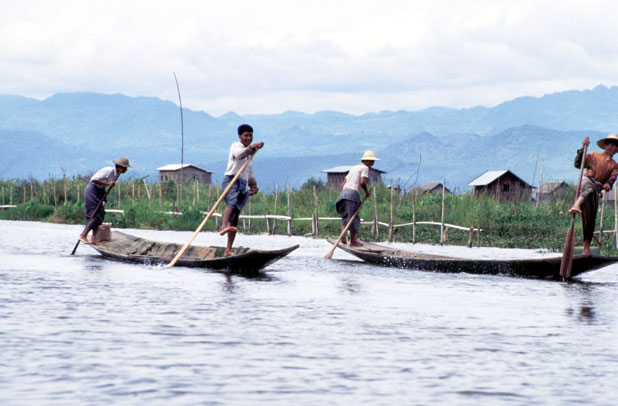 Tradiční pádlování nohou na jezeru Inle. Myanmar (Barma).