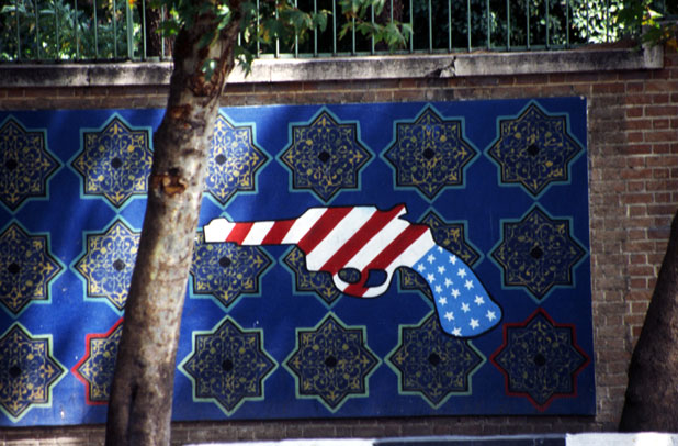 Politická propaganda na zdech bývalé ambasády USA. Teherán. Írán.