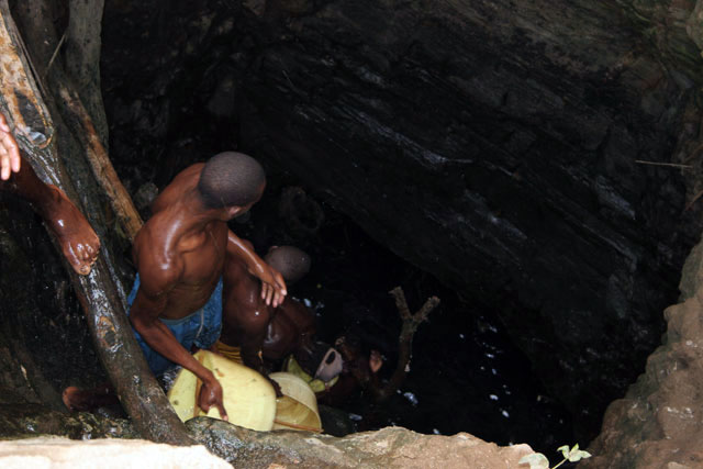 Vodu je vynášena řetězcem mužů z cca 10m hluboké studny do malé nádržky. Muži pro synchronizaci při podávání nádob zpívají. Zpívající studny, vesnice Dublock. Jih, Etiopie.