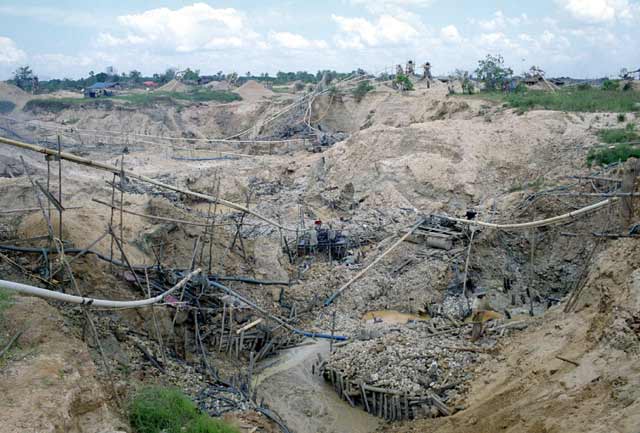 Muž rýžující diamanty v diamantovém dole v Cempaka. Kalimantan, Indonésie.