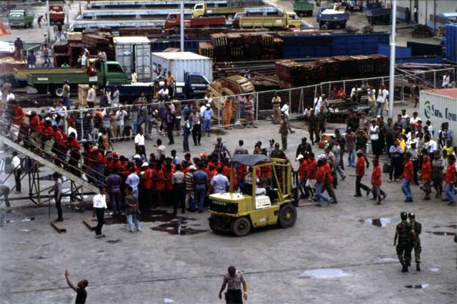 Chaos v přístavu Biak po příjezdu Pelni lodě. Papua, Indonésie.