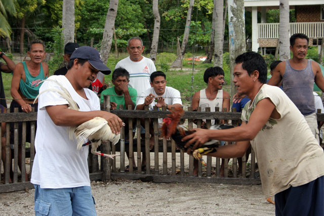 Než začne zápas, je třeba kohouty bojovně naladit. Sázející mají ještě posledních pár minut si rozmyslet sázky a bedlivě sledují chování kohoutů. Malapascua. Filipíny.