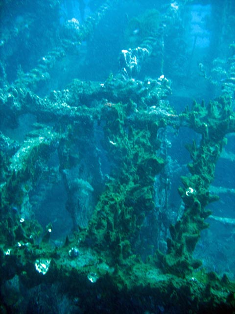 Vrak holandské obchodní lodi potopené v roce 1942. Potápění u ostrova Bunaken, lokalita Molas Wreck. Sulawesi, Indonésie.