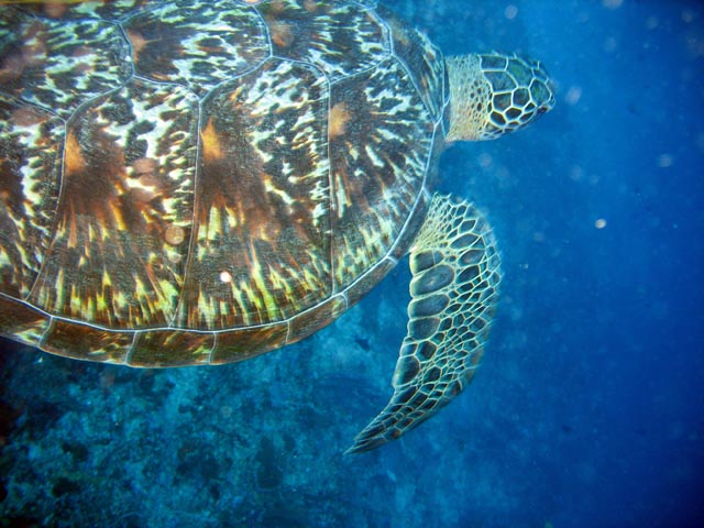 Želva. Potápění u ostrova Bunaken, lokalita Lekuan I. Sulawesi, Indonésie.