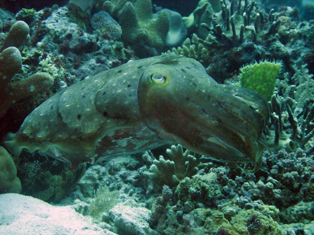 Sépie, Potápění u ostrovů Togian, Kadidiri, lokalita Labyrint. Sulawesi, Indonésie.