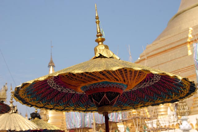 Deštník jako dekorace i ochrana před sluncem. Oslava přijímání nových mnichů do kláštera, Shwedagon Paya, Yangon. Myanmar (Barma).