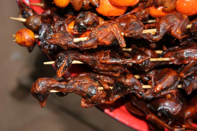 Jídlo do autobusu, tak jak ho nabízejí pouliční prodejci u silnice jižně od Yangonu. Myanmar (Barma).