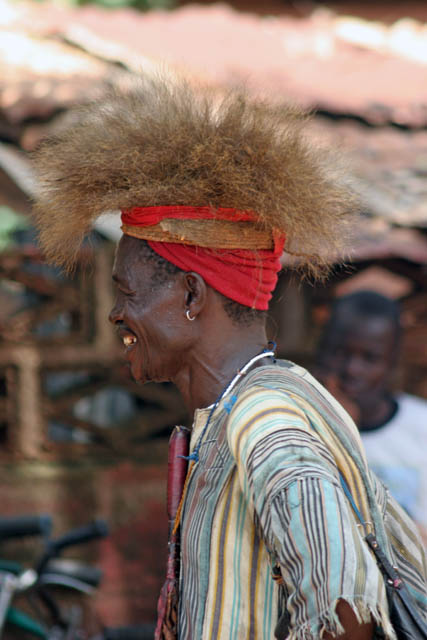 Muž z etnika Somba (někdy též nazývaní lidé Betamaribé). Podle oblečení se jedná pravděpodobně o šamana. Oblast Boukoumbé. Benin.