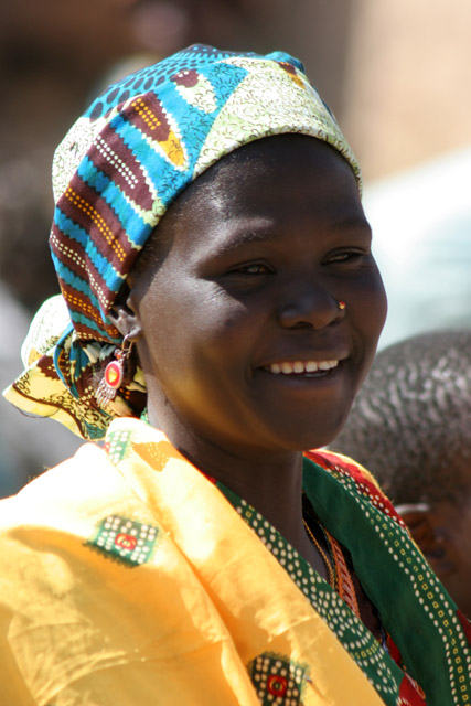 Žena ve vesnici Tourou v pohoří Mandara. Místním zvykem této vesnice jsou čepice z dřevěných kalabašů (druh tykve), které ženy nosí na hlavách. Kamerun.