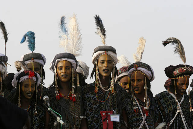 Muži z kočovného etnika Wodaabé (nazýváni též Bororo) tančí svůj tanec krásy nazývaný Yaake. Slavnost Cure Salée (Léčba solí) ve městečku In-Gall. Niger.