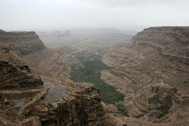 Pohled na horskou pevnost Kawkaban postavenou na hoře Jebel Kawkaban ve výšce 2800 metrů. Jemen.