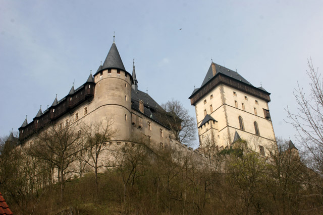 Hrad Karlštejn. Gotický hrad založený v roce 1348 Karlem IV. jako místo pro uložení královských pokladů, sbírek svatých relikvií a říšských korunovačních klenotů. Česká republika.