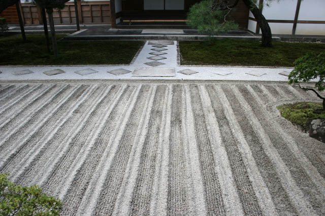 Chrám Ginkaku-ji (nazývaný též Chrám Stříbrného pavilonu) je zenový chrám, který je obklopený velmi zajímavou zahradou, kde můžete najít i tyto zenové prvky, Kjóto. Japonsko.
