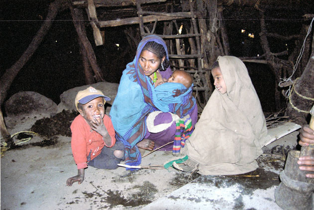 Obyvatelé tradiční chýše v malé vesničce v Simienských horách. Sever, Etiopie.